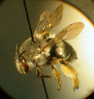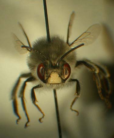 Common Name: silver bee Scientific Name: Habropoda miserabilis Flight season: March- early June Recognition characters: Large (15-21mm), robust bees with dense silvery-gray pile on the thorax, sparser on abdomen. Females carry pollen in scopae (brushes of specialized hair) located on the hind legs; males have white marking on lower face.